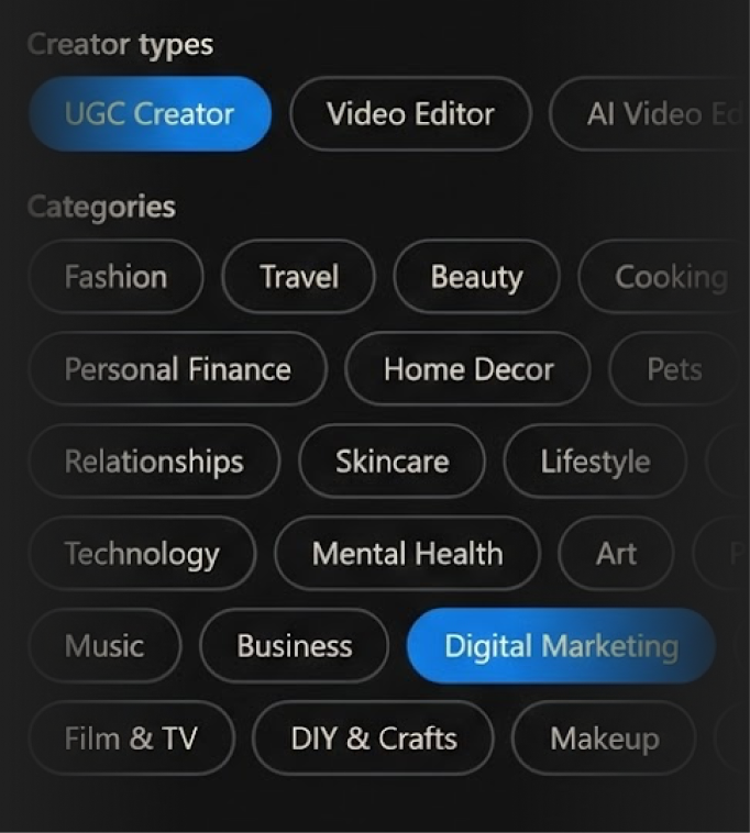 Build your profile, content style, niche, and availability. Match with brands looking for UGC.